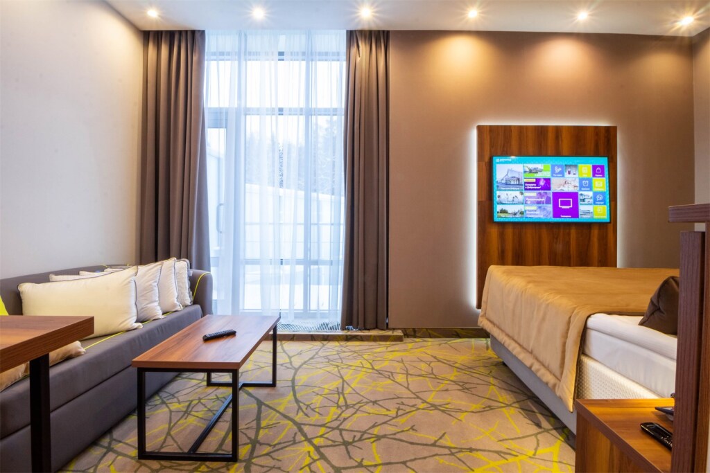 Утром — выпейте кофе, наблюдая из окна за жизнью города. Для гостей работает ресторан Терраса и Доброград. В отеле есть бесплатный Wi-Fi. Если гости путешествуют на машине, припарковаться можно будет на парковке рядом. Также для гостей в отеле: СПА комплекс, массажный кабинет и сауна. Спортивные гости оценят фитнес-центр и настольный теннис. В отеле для поклонников зимних спортивных развлечений возможно катание на лыжах. Готовьтесь к весёлому и насыщенному отдыху! На территории есть караоке, площадка для пикника и площадка для барбекю. Для бизнес-мероприятий предусмотрен конференц-зал. Дети будут рады! Работает детский клуб. В отеле возможно размещение с домашним любимцем. Чтобы путешествие было не только приятным, но и удобным, гости могут заказать трансфер. Удобно для гостей с ограниченными возможностями: на верхние этажи гостей поднимает лифт. Дополнительно: прачечная, химчистка, банк, банкомат, индивидуальная регистрация заезда и отъезда, гладильные услуги, сейф. Сотрудники отеля поддержат беседу на английском.