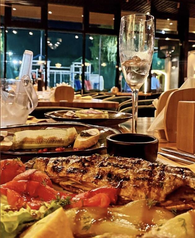 При отеле работает ресторан с оригинальной летней верандой. Ужинали здесь - все было весьма вкусно, вполне на уровне, обслуживание также на высоте. Единственный минус - в выходные во внутренних помещениях отеля происходит своего рода дискотека для тех, кому очень хорошо за : ) Лично мы не против ретро-музыки, мы ее даже любим, но не такой громкости! К счастью, на веранде играло нечто нейтрально-спокойное, и там мы отлично посидели - просто пришлось немного подождать, и для нас организовали дополнительный столик.