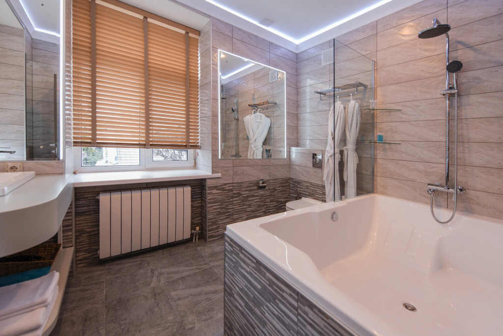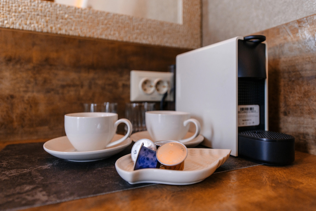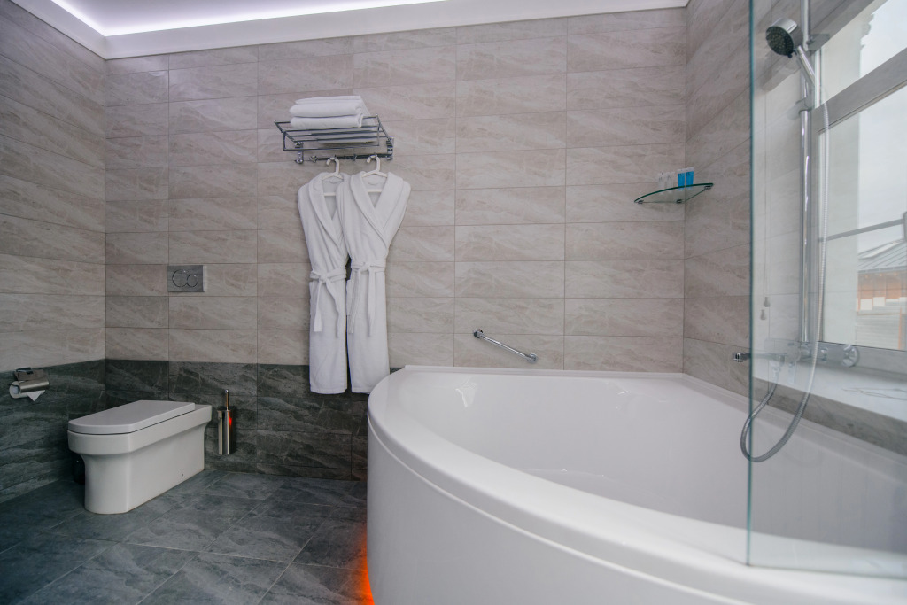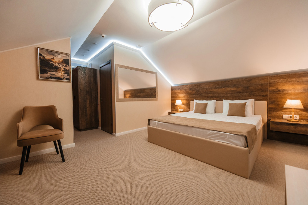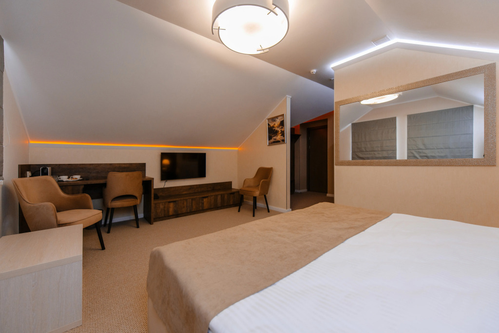 В номере есть: большая двухспальная кровать с ортопедическим матрасом, телевизор, капсульная кофемашина, рабочее пространство, сейф, холодильник, полотенца, халаты с тапочками и необходимые гигиенические принадлежности. Оснащение зависит от выбранной категории номера.