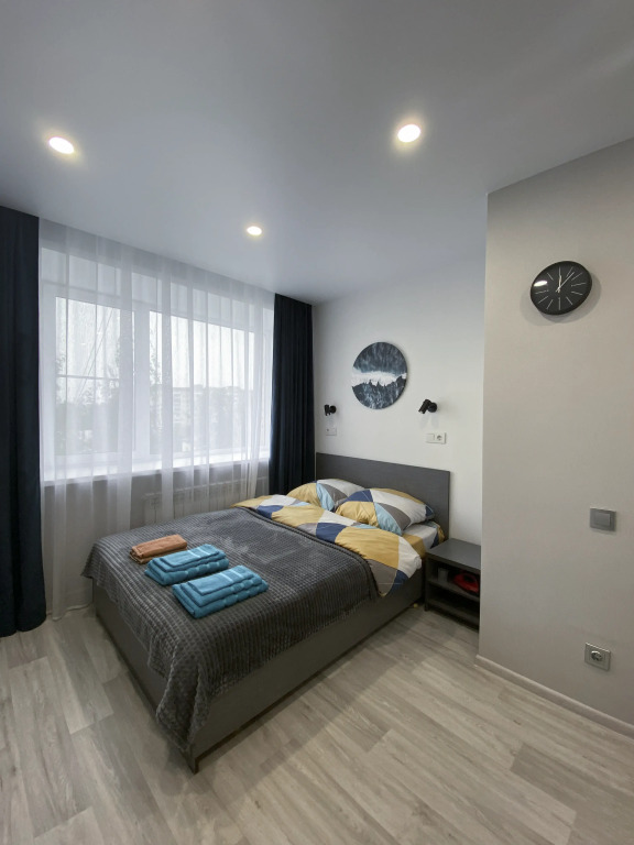 В квартире есть двуспальная кровать с ортопедическим матрасом, подушками и одеялом. Для удобства гостей предоставляются постельное бельё и набор полотенец для каждого гостя. Работает Wi-Fi, есть телевизор с Smart-TV, кондиционер, утюг, гладильная доска, сушилка для белья.