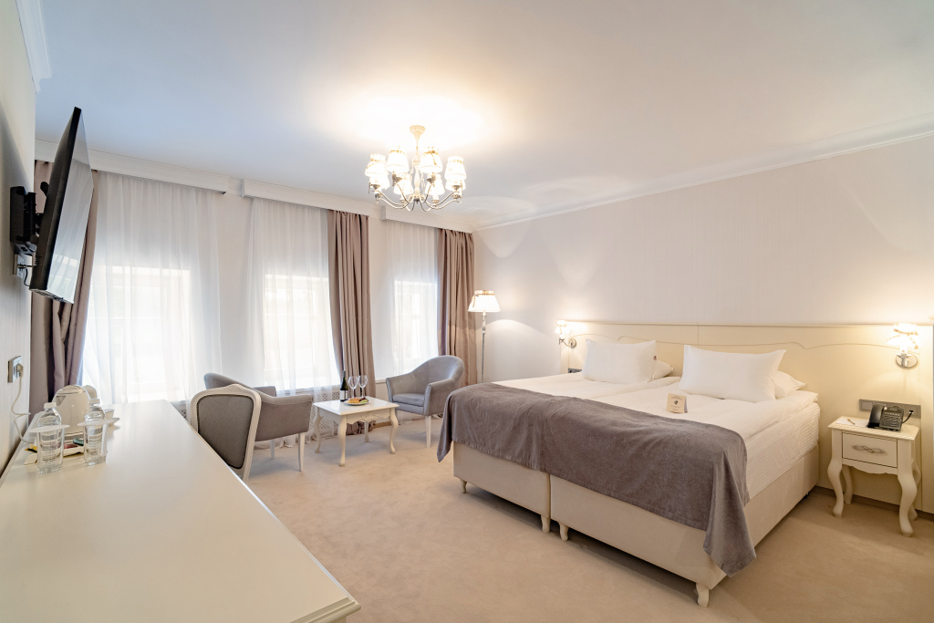 Номер уютно обставлен и оснащён необходимым, чтобы отдохнуть после долгого и насыщенного дня. Имеются телевизор. Оснащение зависит от выбранной категории номера.